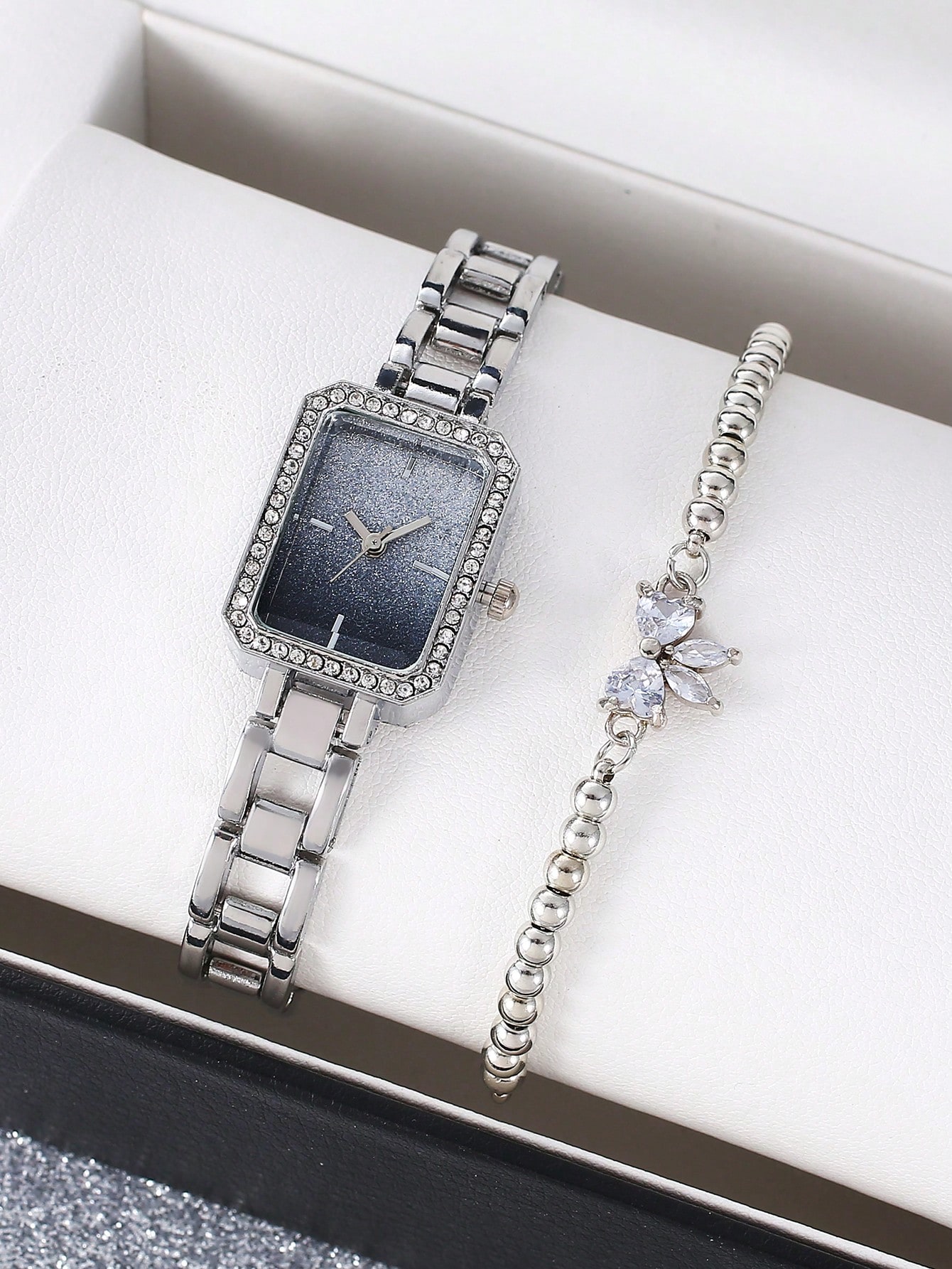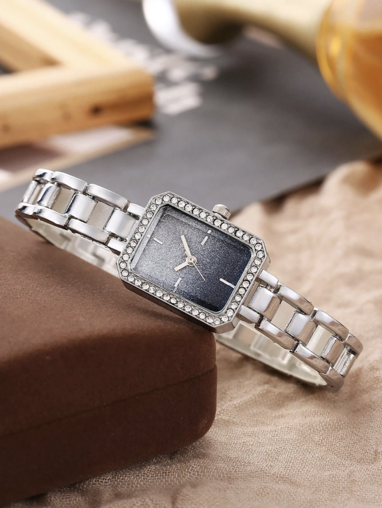انطلقي في عالم الأناقة مع مجموعة الساعة الفضية المرصعة بأحجار الراين مع السوار، المصممة خصيصًا للمرأة العصرية التي تعشق التألق في كل تفاصيلها.